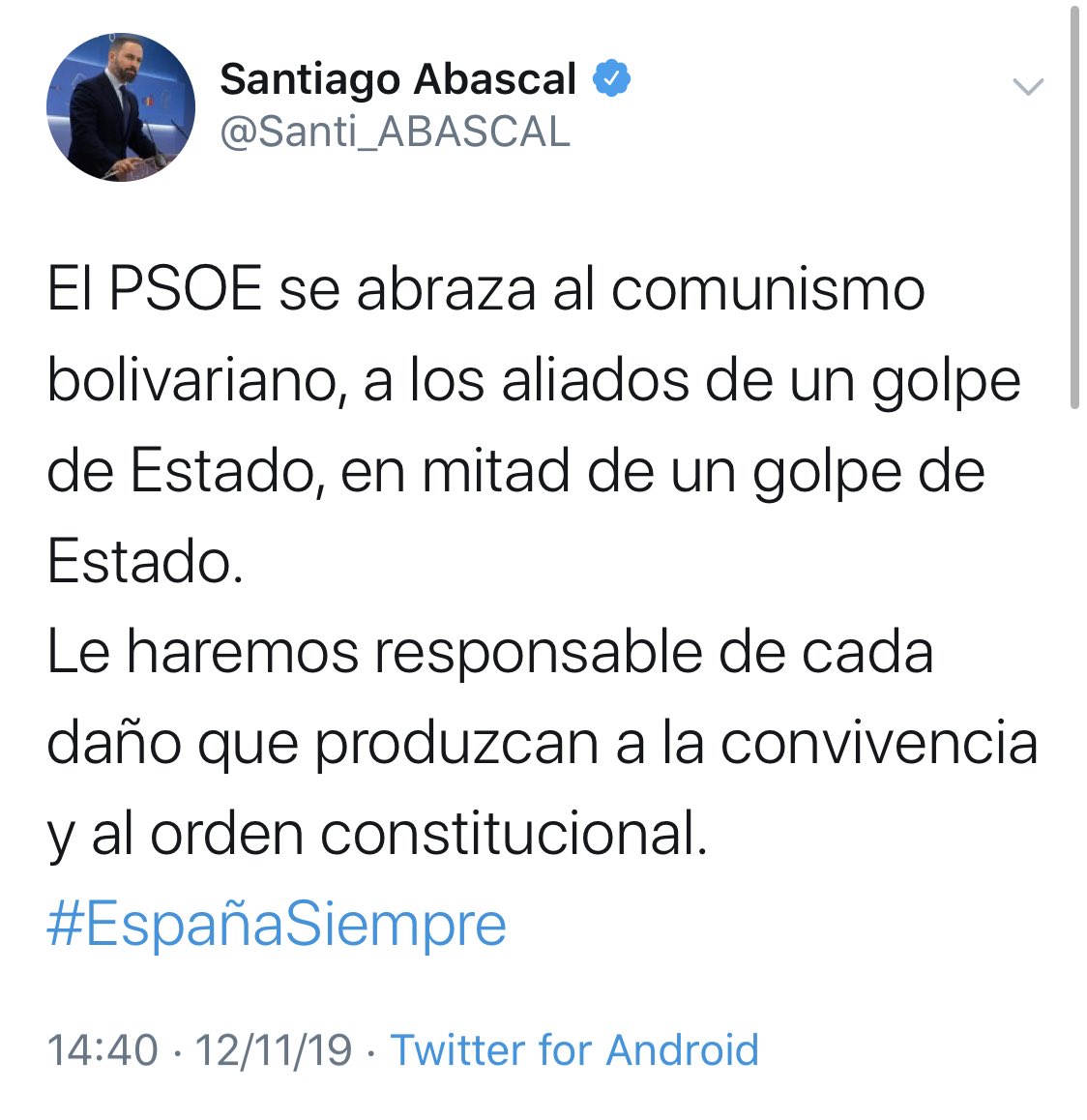 El facherio de raigambre, como los presentes se han 'puesto de manos' ante un Gobierno de Sánchez con Iglesias Estos prendas son de lo más estúpido. No tienen rubor en formar gobiernos con la extrema derecha nazi de VOX y se rasgan las vestiduras porque un comunista entre el Gobierno de España.